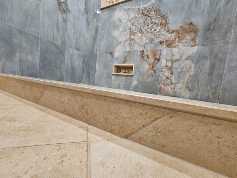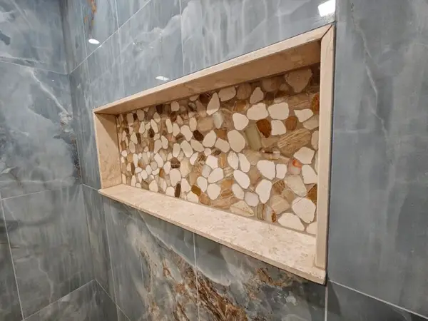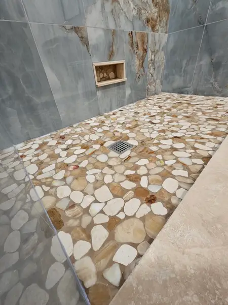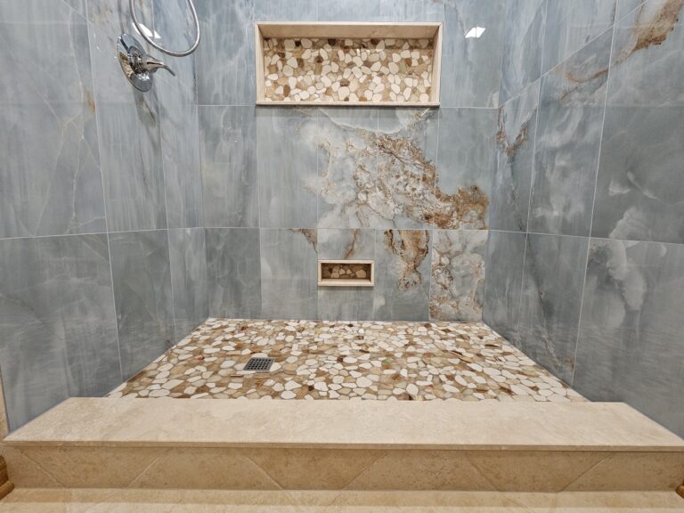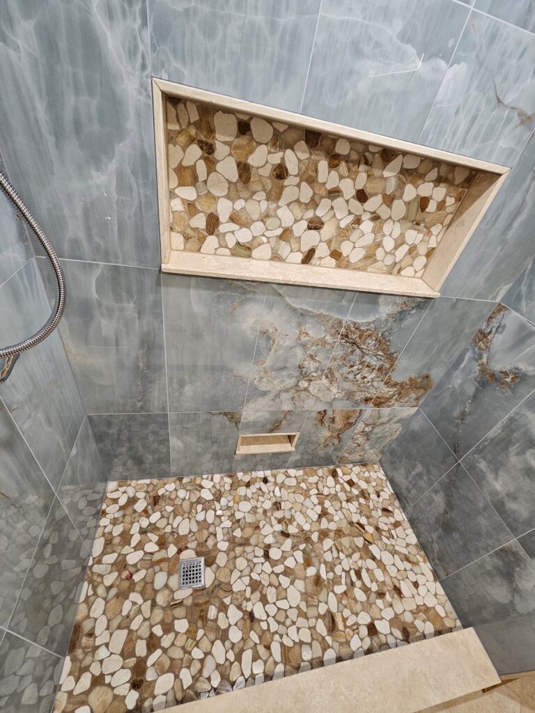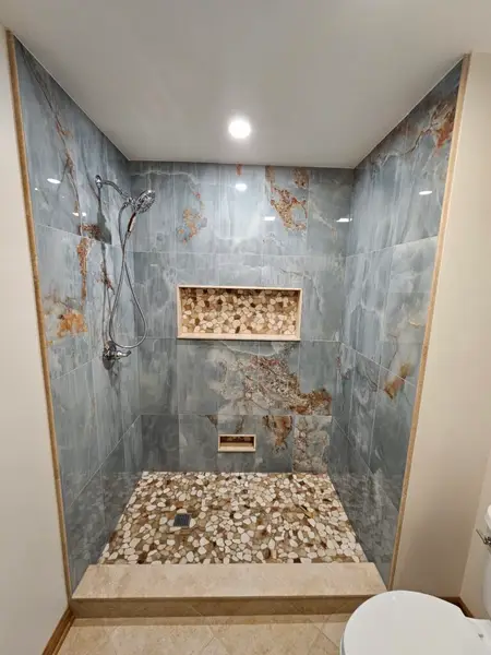 Here is a bathroom remodel project we did in Valparaiso. At Stewart Carpentry, we took out the existing vanity, toilet and fiberglass tub. The customer wanted to maintain their floor tiles as they extend throughout the rest of the basement area. Luckily, they had spare tiles from the same batch in another room. We utilized these for the front of the new shower curb, tying everything together to look like it was all done in one go. Now, there’s a custom shower in place of the old tub, providing more space and adding a relaxing, beachy feel with the pebbles and blue tiles. Get an estimate today!