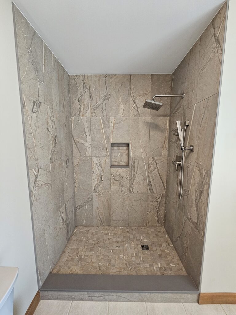 Recently, Stewart Carpentry completed a master bathroom shower remodel with custom niche. This involved a comprehensive renovation of the shower area in the master bathroom, creating a custom niche for convenient storage and an enhanced aesthetic appeal. We aimed to improve both functionality and visual appeal, and the end result was a striking, well-organized shower space that catered perfectly to our client’s needs. No job is too big or small for our team! Get an estimate today!